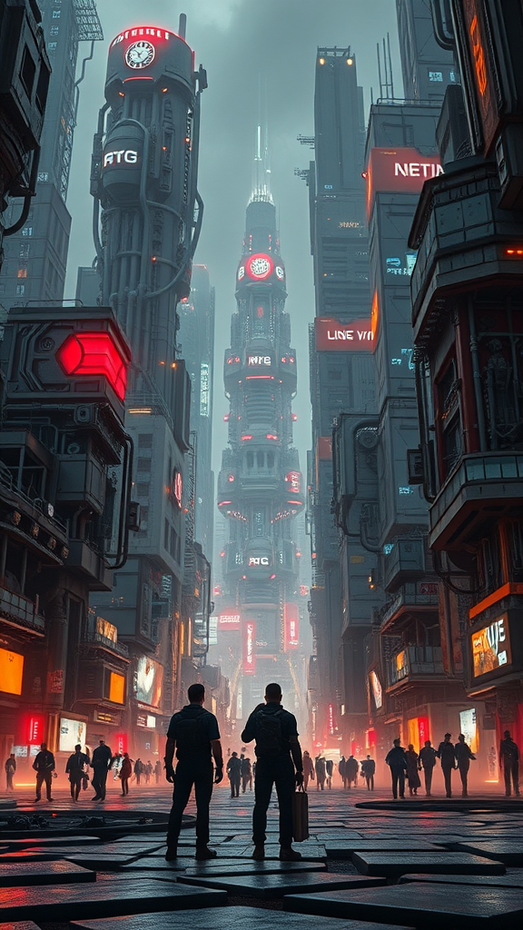 Futuristic individuals stand amidst a sprawling metropolis of advanced sci-fi robotic architecture, enveloped by towering cyborg structures adorned with intricate mechanical designs. The scene is hyper-realistic and cinematic, with meticulously detailed elements creating a stunning composition. High-contrast lighting accentuates the complexity of the urban landscape, casting dramatic shadows and highlights that emphasize the technological marvels surrounding the people. The air buzzes with an electric hum as the city pulses with life, each element meticulously crafted to reflect the convergence of humanity and advanced technology.