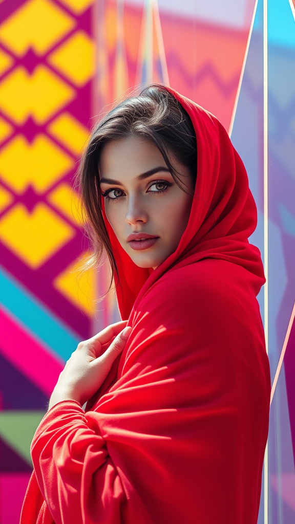 A stunning commercial photograph of a beautiful Instagram fashion model wrapped in red, posing elegantly amidst vibrant geometric patterns. The scene is infused with the style of colorful palettes, reminiscent of Guy Aroch and Helene Knoop's work. Unreal Engine 5-like realism is achieved with glowing pastel hues and bold, striking lines. The image radiates sun-soaked colors captured using a Fujifilm X-T4 and Sony FE 85mm, bringing the essence of bright, dazzling visuals to life with an aspect ratio of 900:1600. The raw style adds an authentic, artistic edge to this vibrant composition.
