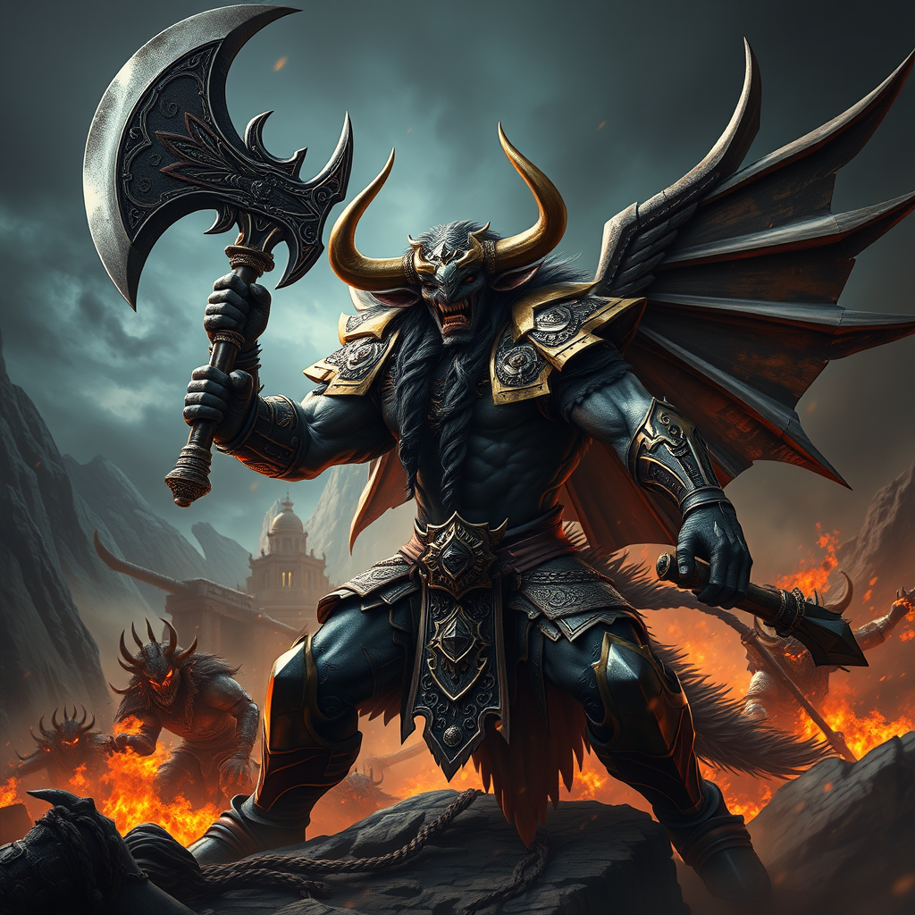 Awe-inspiring minotaur deity wielding a colossal axe, engaged in a fierce battle, adorned in intricately designed black and gold armor exuding a menacing dark aura, captured with the precision of a Nikon D750. The digital illustration is elegantly composed, set against a dramatic and scenic backdrop, showcasing hyper-realistic and hyper-detailed features in stunning 8k resolution. The scene emanates power and grandeur, with atmospheric lighting adding depth and intensity to the composition.