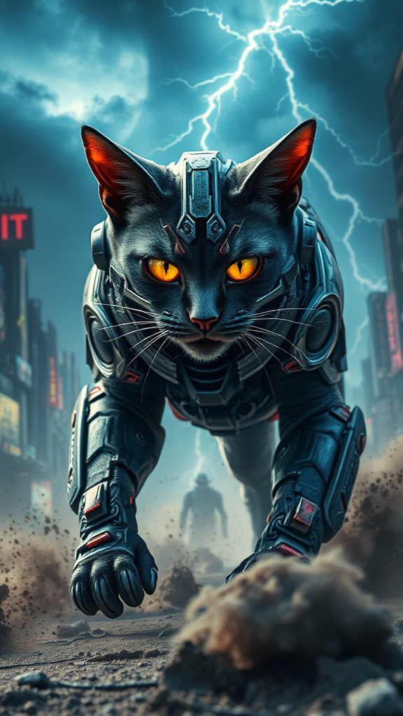 Fierce feline warrior, an enraged cyberpunk cat, prowls amidst swirling dust in a mesmerizing futuristic apocalyptic cityscape. Its intense, glowing eyes reflect a stormy sky illuminated by electric sparks and crackling lightning. The intricate details of its sleek armor glisten in 4K resolution, capturing the essence of a sci-fi movie poster.