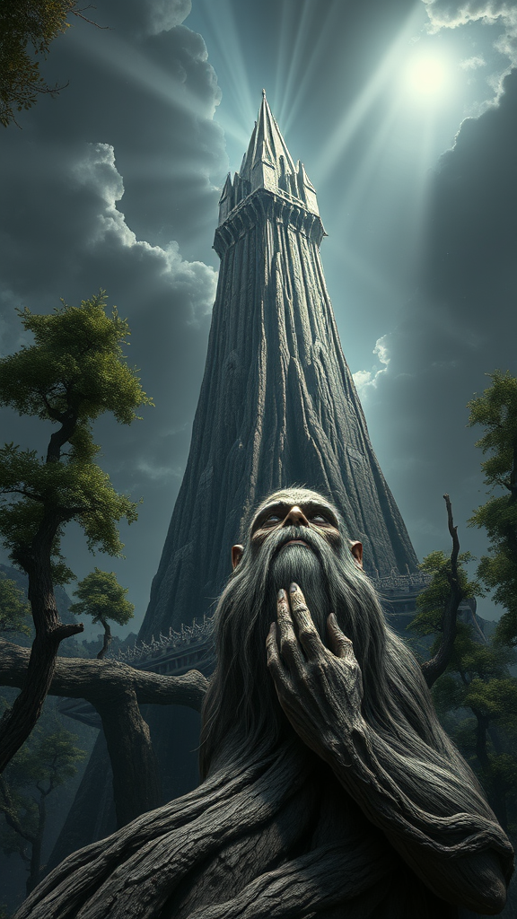 Treebeard at the base of the majestic tower of Orthanc, an intricately detailed scene capturing the essence of fantasy and surrealism, reminiscent of the styles of Alan Lee and John Howe. This digital painting, showcased on ArtStation, is highly detailed with sharp focus and a wide-angle perspective. The atmosphere is a blend of stunning beauty and dystopian elements, enhanced by cinematic lighting and god rays piercing through a dark, moody sky. The environment exudes a sci-fi aura, presented in 16k UHD HDR quality. Treebeard’s features are uniquely detailed, with intricate textures resembling the bark and leaves of an ancient tree. His eyes are expressive and full of wisdom, gazing at the tower with a sense of ancient understanding. The composition avoids imperfections like cloned faces, extra fingers, or mutated hands, focusing instead on a harmonious blend of fantasy realism. The art does not suffer from common pitfalls such as cropping, low resolution, or artifacts, and is free of any signatures, watermarks, or text. The image captures the grandeur of the scene, ensuring that Treebeard’s stature and the towering presence of Orthanc are central to the visual narrative, all perfectly framed without elements being out of place.