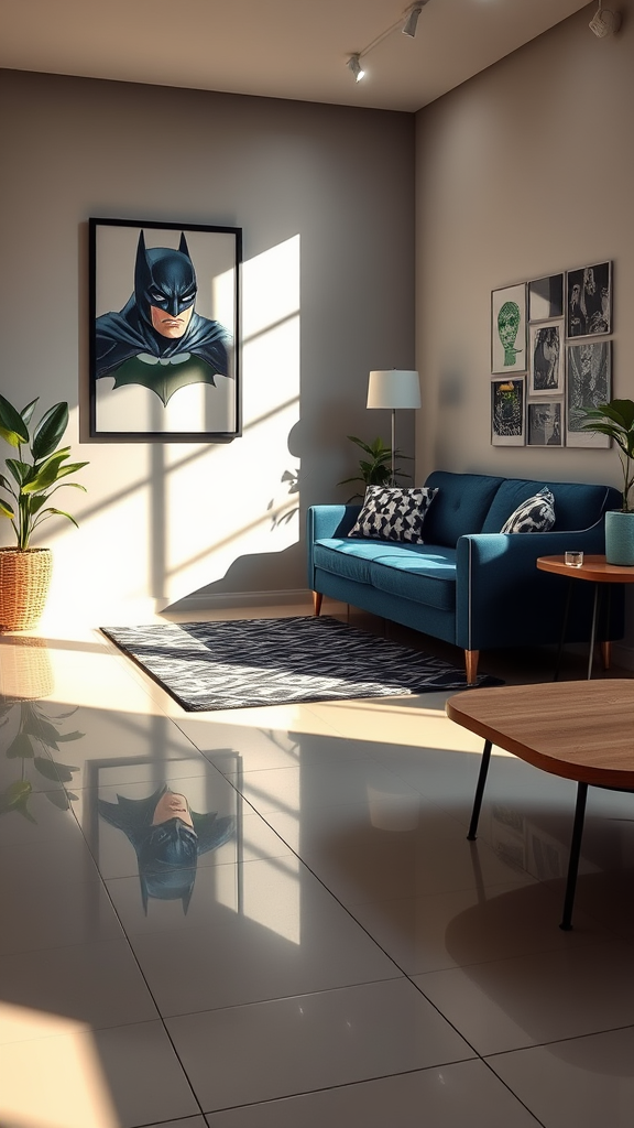 Capture a morning scene in a contemporary lounge featuring a glossy tile floor and a stylish rug, accented by a dark blue sofa set and a sleek wooden side table. A striking Batman illustration art piece adorns the wall, while soft natural light fills the room, enhancing the serene yet modern atmosphere. The setting exudes an ultra-high-definition clarity with subtle creative touches, maintaining a raw and authentic style.