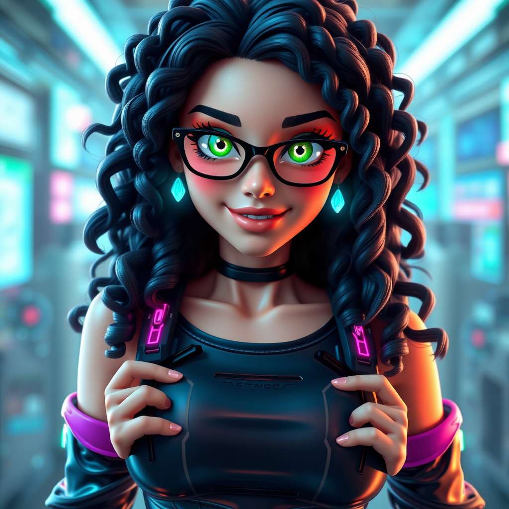 3D cybergirl with a playful expression, hands confidently on her hips, wearing sleek glasses. Her highly detailed face showcases striking emerald green eyes and long, jet-black curly hair. Rendered in a futuristic style with no background, the image is an ultra-detailed 8k render with a vibrant, front-lit composition. The scene captures her lively spirit and state-of-the-art aesthetic in the best quality, adding a touch of metallic sheen to her attire and subtle neon accents to complement her cybernetic theme.