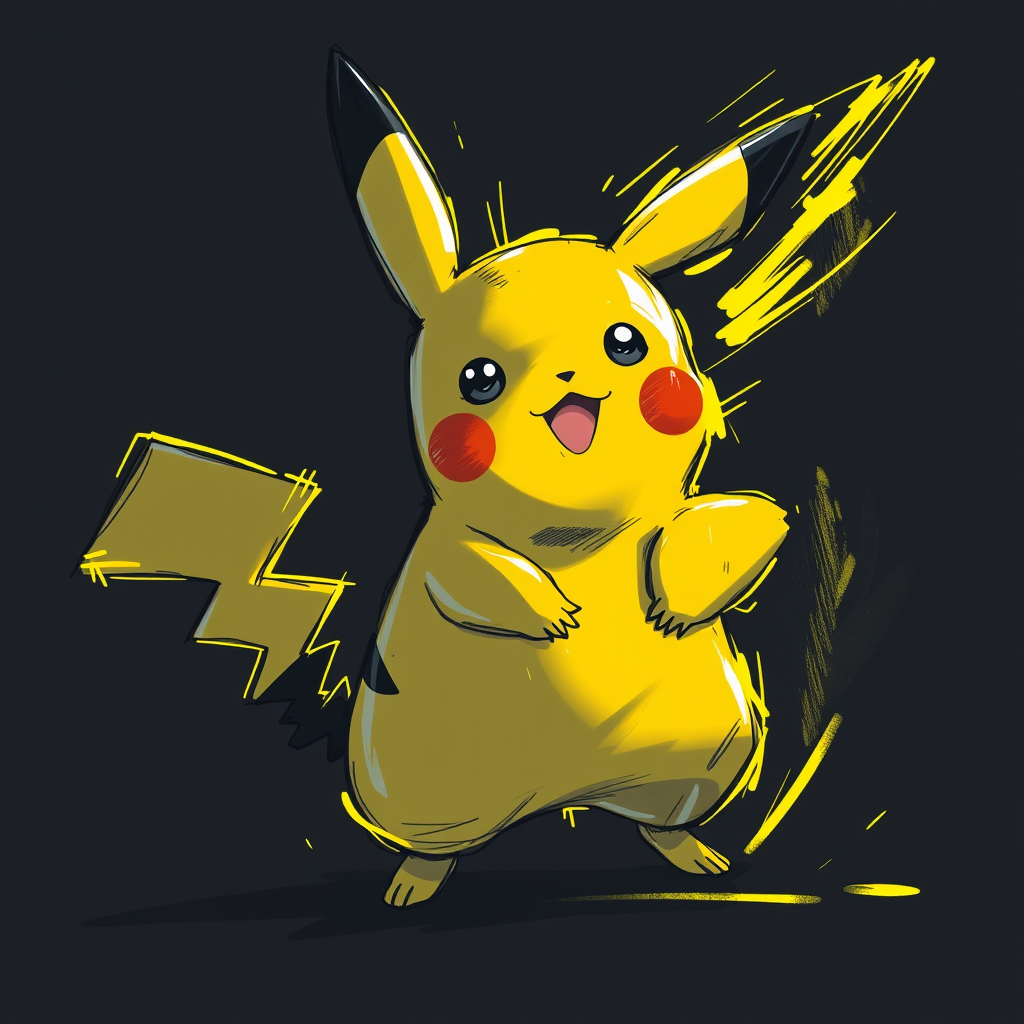 Pokemon Pikachu in a dynamic stance, depicted in an anime style with sketch-like qualities, incorporating nvinkpunk influences. The piece features abstract brush strokes and emphasizes heavy lines, rendered in a HDR Neo-Noir style with bright yellow neon highlights, maintaining a minimalist approach.