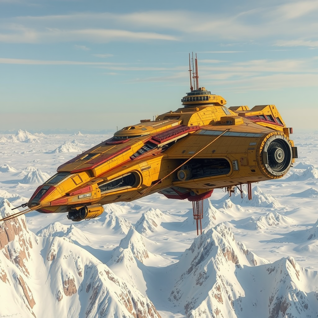 Futuristic spacecraft gliding above a frozen landscape, swathed in hues of yellow and beige, echoing fantastical ruins in grandiose scale, reminiscent of Viktor Vasnetsov's artistry. This industrial marvel, intricately detailed, embodies a richly built world akin to Dariusz Klimczak’s vision. Its majestic presence, captured in high-definition detail, epitomizes a true masterpiece. The ship hovers above snowy peaks, exuding rusty elegance amidst its modular construction. Imbued with imposing monumentality and the spirit of Leszek Bujnowski, it weaves a tapestry of intricate architecture and world-building reminiscent of Alexei Harlamoff’s style, bringing forth a visual feast of high-detail craftsmanship.