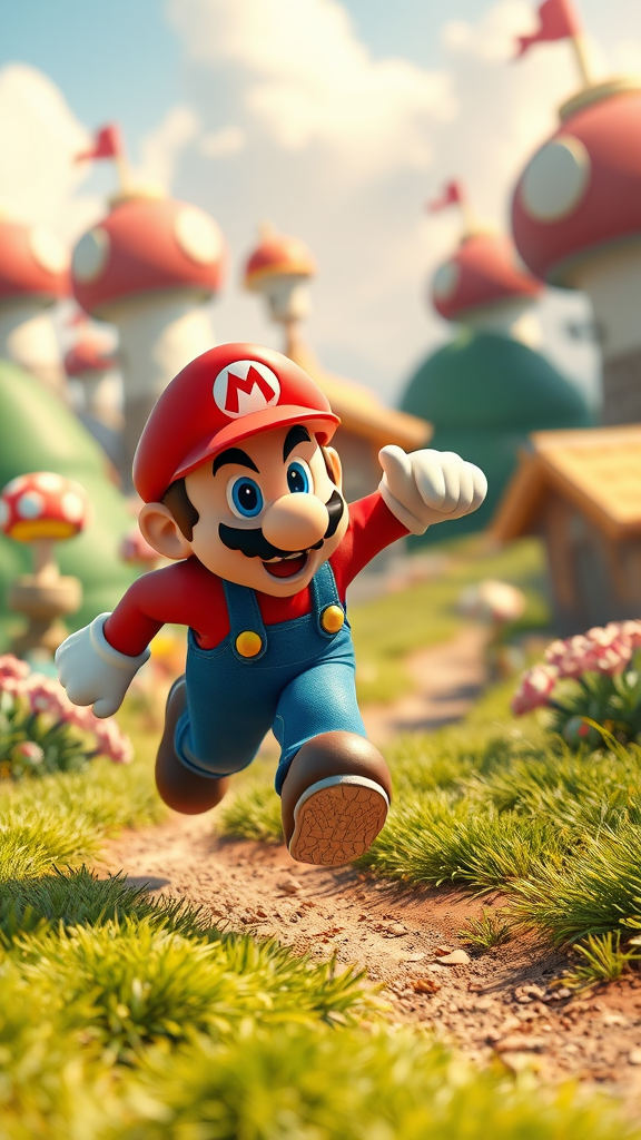 Super-Mario sprinting energetically through the vibrant Mushroom Kingdom landscape, ultra-high definition, closeup detail, inspired by trending poltcount 3D styles, video game aesthetic, vivid colors, dynamic and immersive action, version 5.3, aspect ratio 2:3, smooth textures with subtle tweaks, focus on movement and adventure, engaging and lively scene.