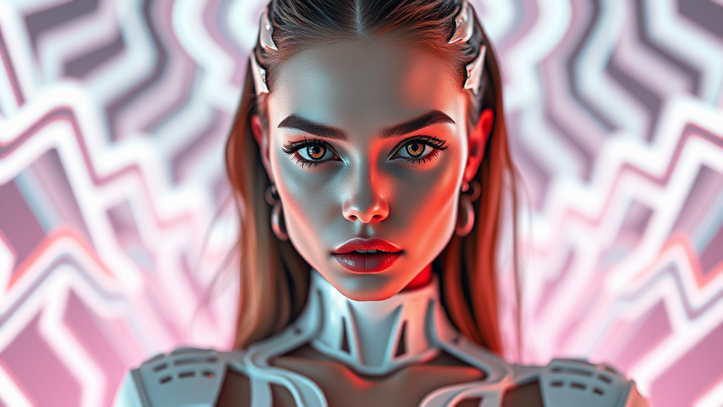 Full body photo of a stunning model in a hyper-realistic DMT-inspired fashion shoot. The image exudes an abstract digital art style featuring vibrant white DMT influences with bold, pop art elements. The scene is enriched with vray tracing effects, creating intricate zigzag patterns. The model strikes elegant, emotive poses, blending human beauty with elements of robotic expressionism. Her eyes are wide open, conveying a powerful and mysterious gaze. The composition adheres to an aspect ratio of 4:5, ensuring a captivating visual balance.