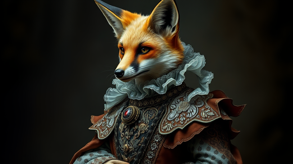 An intricately detailed anthropomorphic fox adorned in an elaborate medieval gown stands elegantly against a dark, gothic backdrop. The art embodies the opulence and drama of a Van Dyck portrait, intertwined with the fantastical style of Peter Morbacher. Inspired by the otherworldly compositions of Aleksi Briclot and the classical beauty reminiscent of Alexandre Cabanel, the fox's attire showcases intricate lace, richly embroidered fabric, and jewels glistening subtly in dim light. Its expressive eyes convey wisdom and mystery, captivating the viewer in a world that balances fantasy and historical elegance. The entire concept is rendered with an emphasis on lavish detail and atmospheric depth, capturing a blend of medieval allure and gothic storytelling.