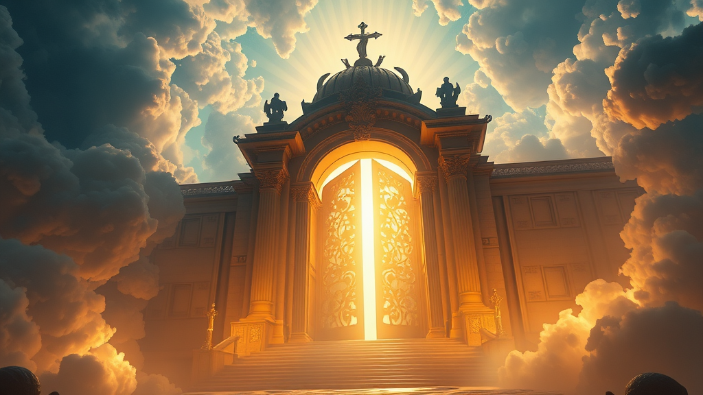 A breathtaking cinematic depiction of the heavenly gates, rendered in exquisite detail at 8k resolution, blending realism with a fantastical ambiance. Inspired by the styles of Ivan Aivazovsky, Peter Mohrbacher, and Greg Rutkowski, this scene features a luminous volumetric light effect and is illuminated by soft, broad lighting. Crafted in the manner of a hyper-realistic oil painting, it merges elements of both fantasy and sci-fi art, suitable for premium prints and reminiscent of creations in Unreal Engine, offering a sense of ethereal majesty and awe.