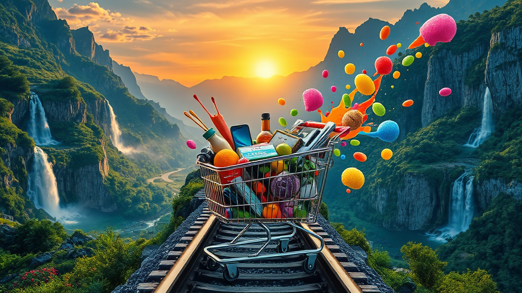 A surreal and vibrant image reveals a dramatic railway track slicing through a picturesque mountainous landscape, adorned with lush greenery and cascading waterfalls. A shopping cart is dynamically perched on the rails, overflowing with a cornucopia of colorful objects symbolizing commercial abundance. The cart brims with a kaleidoscope of items: fresh fruits, vegetables, electronic gadgets, and household items. Whimsical splashes of bright, paint-like textures emanate from it, creating an upward trail extending into the sky. The sun sets in the backdrop, bathing the scene in warm, golden light and casting elongated shadows. This hyper-realistic artwork captures overwhelming vibrancy and kinetic energy, with meticulous attention to the textures and materials of the items, reflecting light and shadows convincingly. The atmosphere embodies fantastical and commercial opulence, fitting into the "Surrealism" or "Modern Fantasies" genre, with a focus on high saturation and dynamic composition.