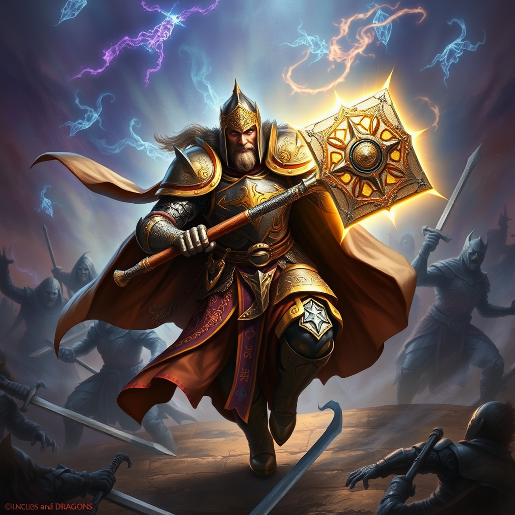 A valiant Dungeons and Dragons paladin, adorned in intricately detailed armor that gleams with celestial symbols, wields a formidable warhammer glowing with holy light. In a dynamic action scene, the paladin charges forward, cape billowing and eyes blazing with righteous fury. The backdrop is a mystical battlefield swirling with ethereal energies, populated by shadowy foes recoiling in fear. The scene exudes the rich, vivid intensity of fantasy art, capturing the paladin's heroic essence and the epic nature of the confrontation.