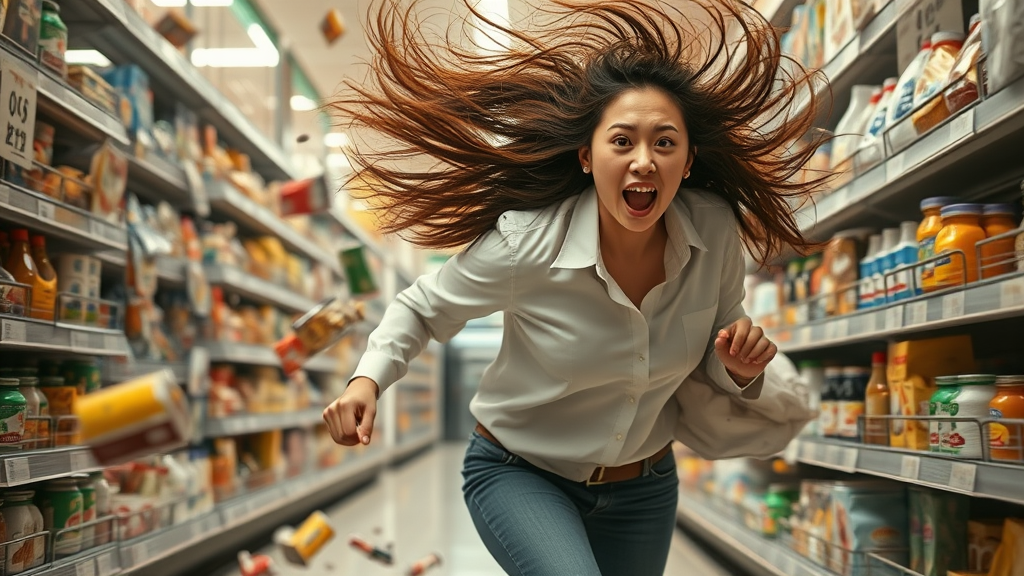 A woman dashing down the supermarket aisle, her hair a cascading whirlwind behind her as products tumble from the shelves, captured in the style of Zhang Jingna. The scene is filled with playful chaos and a sense of urgency, her exaggerated expression of determination lending a humorous touch. The image is photorealistically hyperbolic, reminiscent of the work of Yasuo Kuniyoshi and Jessica Drossin, with a low-angle perspective enhancing the action. The lighting is dramatic, casting dynamic shadows that emphasize her swift movement and the vibrant colors of the surrounding chaos.