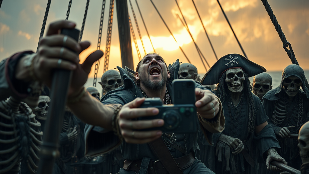 Epic portrait of an orc crew capturing a selfie amidst skeleton pirates on a storm-battered pirate ship, dramatic rainy weather, golden hour glow breaking through the clouds, RAW footage, shot in 8k UHD with a DSLR, featuring soft and moody lighting, high-quality imagery with subtle film grain, Fujifilm XT3 composition, blending an adventurous and mythical atmosphere.