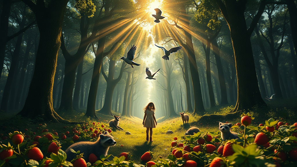 A young girl wanders through a sprawling, enchanting forest, where the sun casts golden beams through the canopy. Birds dance in the sky above, their colors vivid against the bright blue. Gentle fawns graze nearby, and playful raccoons scurry through the underbrush. A sly fox watches from a distance, its fur gleaming in the sunlight. Vibrant strawberries pepper the forest floor like hidden treasures amidst towering trees. The scene captures the intricate, awe-inspiring beauty reminiscent of a Hayao Miyazaki film. Presented in stunning 8k HD, every detail is highlighted with contour lighting and high contrast, creating a breathtaking depth of field. Photorealism and ultra-detail bring this cinematic moment to life, featuring an intricate bokeh effect and super realistic textures. The scene exudes an epic, yet mysterious ambiance, heightened by a touch of gigantism that evokes wonder from a first-person perspective. The dark tone of the forest contrasts with the luminescent highlights, enveloping the viewer in an unforgettable, dreamlike narrative.