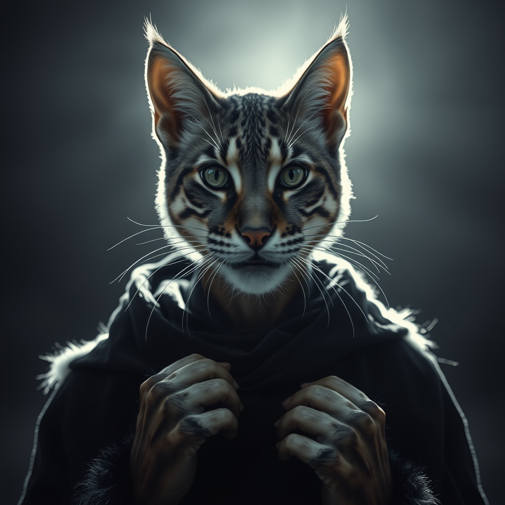Full-length portrait close-up photograph, highly detailed feline facial features, playful expression toward the camera, head, male humanoid figure, dressed in obsidian druid robes, set in an outdoor environment with dramatic cinematic lighting casting intense brightness, captured in a dynamic pose, adorned with fur trimmings, featuring intricate, life-like realism with a touch of flawed artistry, monochrome palette, simplistic and noise-filled background, slight imperfections in proportions, fused fingers, wearing a hood, additional feline ears, and featuring cool color tones.