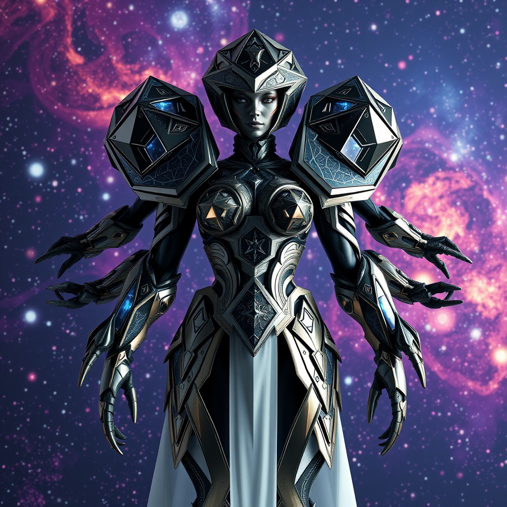 Dodecahedron-inspired multiverse galaxy armor with high fashion elements, set against a vibrant galaxy background. The artwork is symmetrical and exhibits hyper-realism, with stunning attention to detail. Rendered using Octane, it showcases ultra-realistic galaxy reflections and intricate designs. The scene is brightly lit and hyperrealistic, utilizing Unreal Engine 5 for a cinematic effect, resulting in a true masterpiece at 16k resolution. The character design features unique proportions and numerous limbs, creating an otherworldly and abstract aesthetic. The anatomy is intentionally distorted, with extra legs and arms contributing to a surreal, artistic vision. The model resembles a beautifully crafted 3D doll, emphasizing the surreal and fantasy aspects of the multiverse theme. With touches of mutation and unpredictability, the piece balances between abstraction and high detail, capturing an extraordinary fusion of fashion and cosmic wonder.