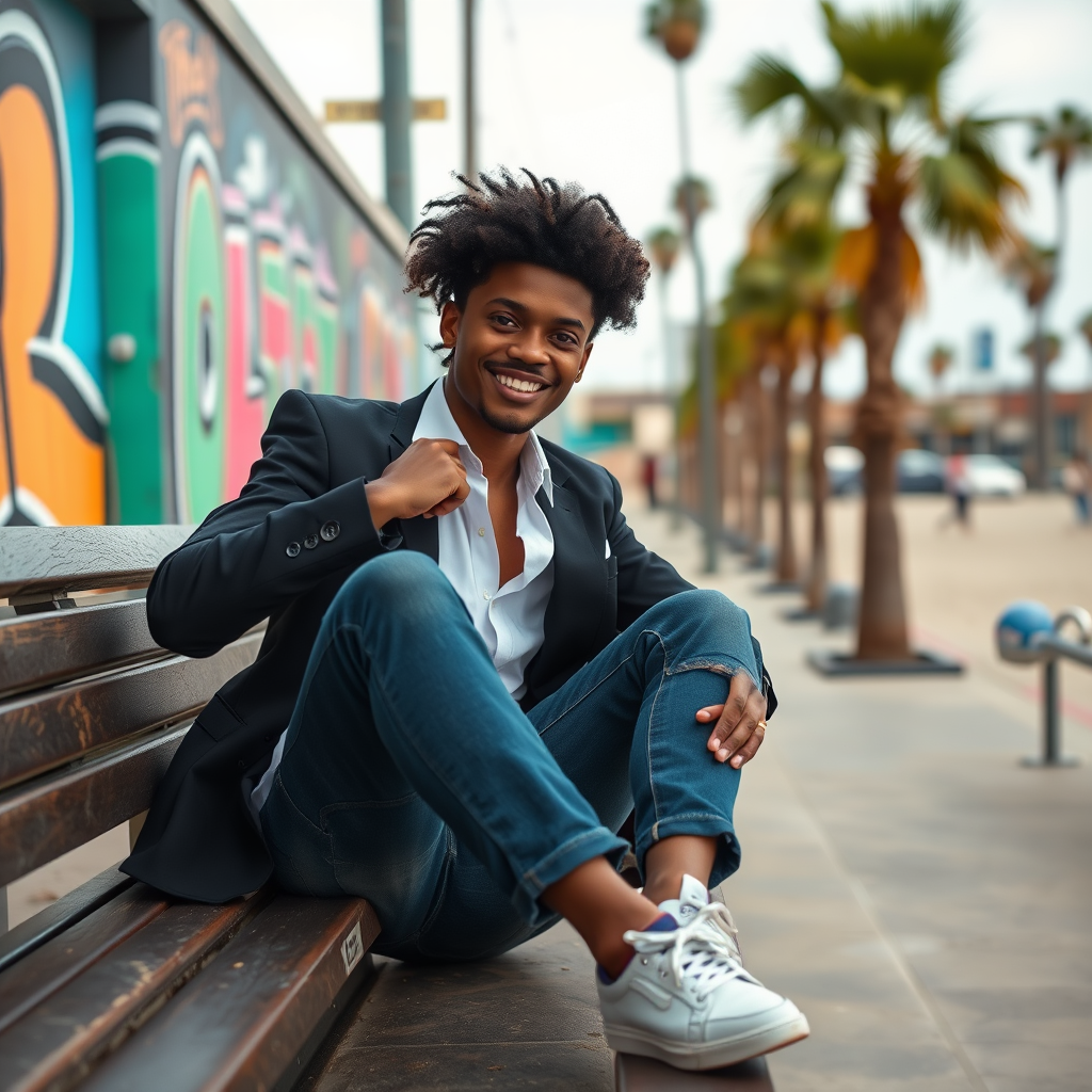 Florence Pugh inspired half-up half-down black hairstyle: This versatile look blends effortlessly flowing hair with a sleek pulled-back section, secured by a stylish hair tie or clip, making it perfect for school or social gatherings. Embrace a casual charm with the sitting or leaning pose in a visually appealing spot like a bench, staircase, or wall. Relax naturally, perhaps crossing your legs, to convey an effortless and relaxed vibe. Enhance your photos with a casual-chic attire that marries comfort and sophistication, like well-fitted jeans, a crisp white button-down, and a tailored blazer, highlighted by statement accessories or trendy sneakers. Capture vibrant moments at Venice Beach with its dynamic atmosphere, posing against colorful graffiti walls, majestic palm trees, or the sandy beach with the ocean breeze. Ultra high-resolution shot using a Canon EOS R6, 135mm, at 1/1250s, f/2.8, ISO 400. The focus is on a smiling young male with curly hair and an afro, evoking a cheerful energy. Avoid elements like watermarks, negative aesthetics, and enhance the scene with genuine shadows for a natural and appealing image.