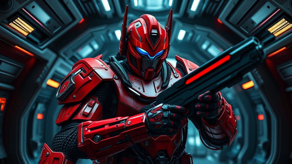 Create an ultra-wide photo featuring a powerful red sci-fi warrior adorned in intricate cyber armor, complete with a complex cyber helmet illuminated by vibrant lights on the mask. The warrior, resembling a design inspired by Optimus Prime, stands in an active and aggressive pose, exuding strength and defiance. Their full armor is highly detailed and insulated, complementing their bald head. In one hand, they wield a formidable weapon, capturing the tension of a sci-fi dark movie aesthetic. Set against the backdrop of a sophisticated spaceship interior, the scene is captured with natural light, photorealism, and cinematic rendering enhanced by ray tracing. The photograph is taken in a Third-Person View, incorporating a subtle blur effect and long exposure. Presented in 8K Ultra-HD, it utilizes moody and cinematic lighting for an intense and immersive experience.
