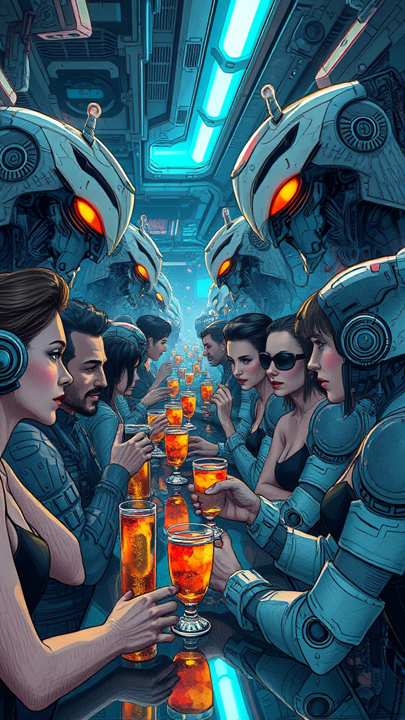 Futuristic sci-fi people enjoying drinks in a bar, surrounded by intricately detailed robotic cyborgs, featuring hyper-realistic and cinematic composition inspired by Federico Pelat and Jan Urschel, with intense attention to mechanical and sci-fi elements. The scene includes a mix of drawing, painting, and cel-shading styles, capturing the vibrant atmosphere with hints of make-up and lipstick artistry. The setting is bustling with artstation HQ-quality visuals, showcasing an engaging and immersive sci-fi ambiance.