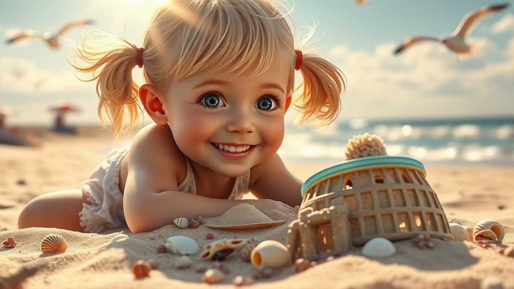 Masterpiece illustration featuring a low shot closeup of a child sitting on sand with a bright smile and adorable expression. The child has exceptionally detailed big eyes and blonde hair styled in pigtails. They are happily engaged in building a sandcastle using a plastic bucket, surrounded by shells and sea life. The scene is illuminated by dramatic sunlight with lens flare effects, set against a beautiful beach landscape. The image is rendered in stunning detail at 16k UHD HDR resolution. Small whimsical elements like a gentle breeze tousling the child's hair and seagulls flying in the background add charm to this vibrant and joyful beach moment.