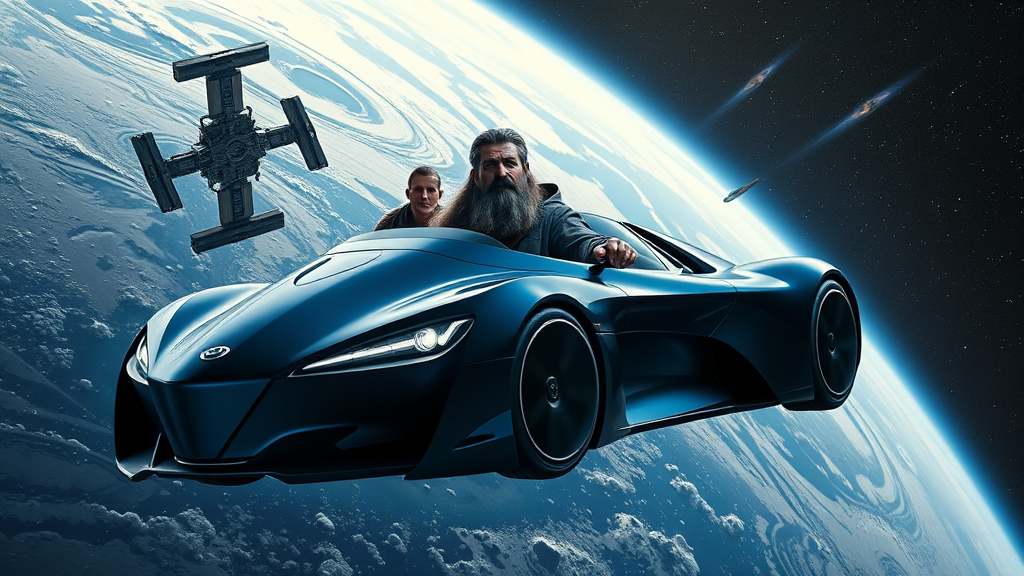 A highly detailed 8k photorealistic image of a futuristic car in a weightless state, painted in a dark blue color, approaching a space station visible against a backdrop of stars and Earth from space. The scene features an imaginative spaceship design with insane attention to detail. Two individuals are prominently featured, both with unique characteristics—a big head, long beard, and wearing pointed footwear. Their expressions reflect a blend of curiosity and determination. The setting is set against a breathtaking cosmic vista, incorporating the interplay of light and shadow in space. This composition is intended to be sleek and futuristic, reminiscent of a sci-fi adventure.