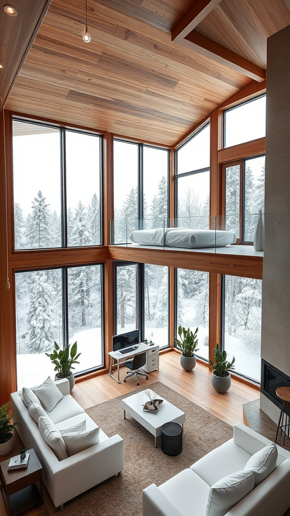 "An elegant modern loft-style room with large floor-to-ceiling windows overlooking a snowy forest. The room features a cozy interior with wooden accents, a double-level design, and natural light. The upper level has a minimalist bed with white bedding, while the lower level includes a living space with comfortable white sofas, a sleek desk with a computer setup, and a warm fireplace surrounded by plants. The ambiance is serene, blending warmth and luxury, with snow falling gently outside the window."