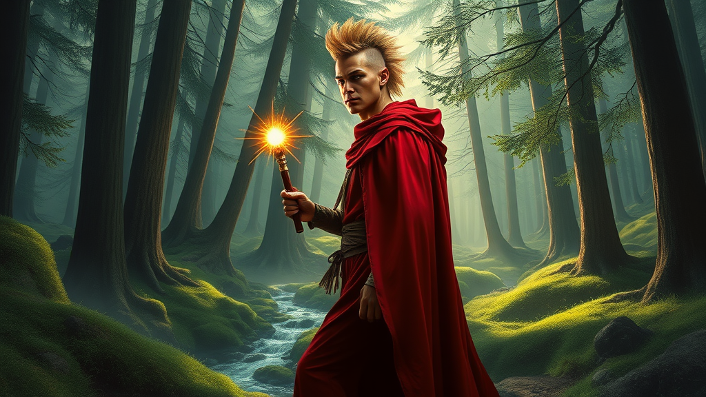 A tall and slim Raistlin the sorcerer strides confidently through a lush, mystical forest, his form draped in his signature red robe, radiating an enigmatic aura. His golden skin glimmers subtly from beneath the deep shadows cast by his red hood. In his hand, a glowing wand emits a mesmerizing light that dances across the landscape, highlighting the towering trees and a sparkling stream weaving through the forest. His face, detailed and expressive, draws focus to his piercing eyes. The scene captures a photorealistic masterpiece in 8k resolution, reminiscent of works by Jeremy Mann, Sandra Chevrier, and Maciej Kuciara. Realistic shadows play across the ground, enhancing the three-dimensionality of the setting. His head sports a distinctive mohawk adding to his unique presence, a creative twist that enriches the iconic character's portrayal.