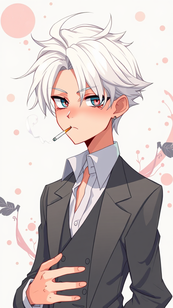 A stylish character with striking white hair and sharp eyes, exuding a gentle aura while holding a cigarette. Dressed in a sleek suit, his presence is both captivating and serene. The illustration embodies the unique blend of digital artistry influences from Yanjun Cheng, Beeple, Rhads, and Lois van Baarle. The character is depicted in a cartoon-like style with bright pastel colors, evoking the charm of a retro anime protagonist. The background features whimsical abstract elements, enhancing the character's mystique and timeless appeal with a slight futuristic touch, maintaining the overall captivating aesthetic.
