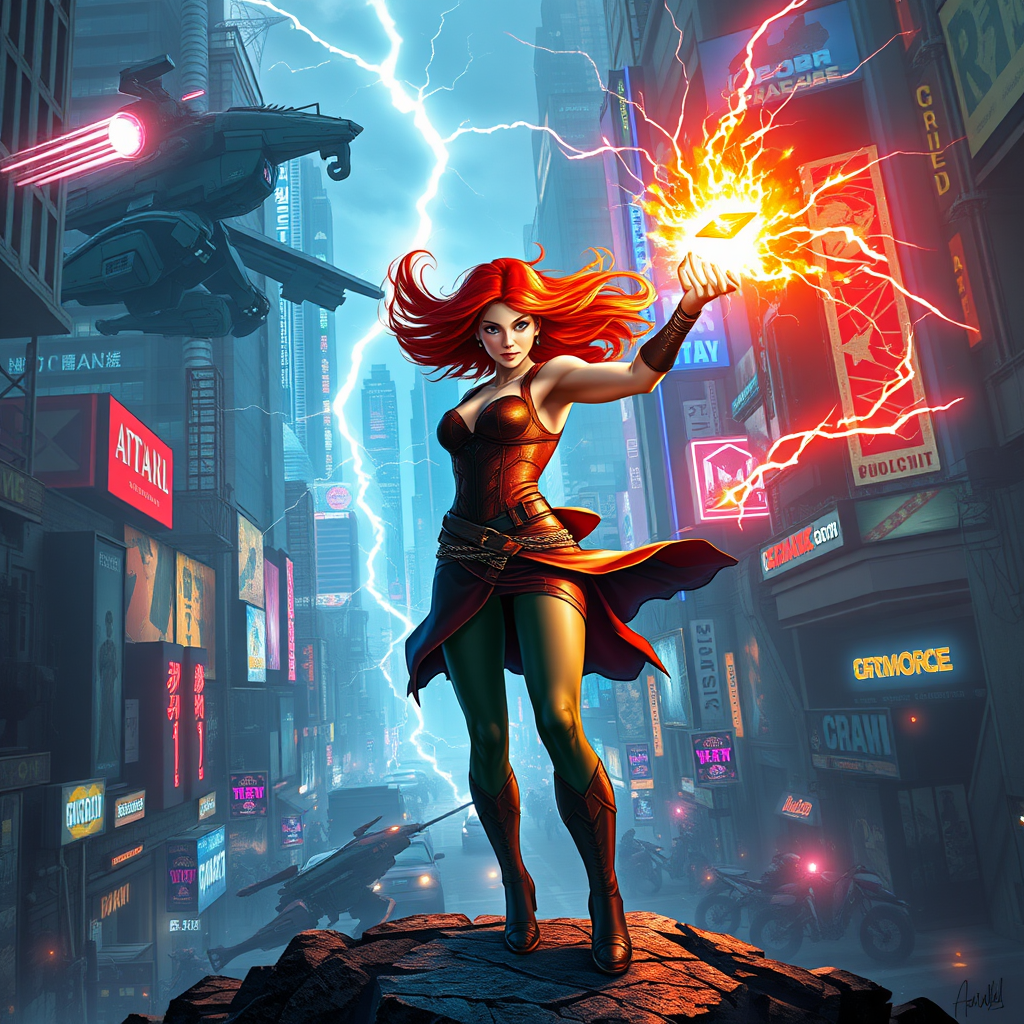 Triss Merigold stands in the heart of a bustling metropolis, casting a radiant spell as futuristic robots descend upon the city. The air crackles with electricity from an electric arc, illuminating the war-torn backdrop of a cyberpunk landscape. Her fiery red hair whips around her as she channels her magical powers, creating a mesmerizing contrast against the neon-lit city skyline. The scene is a captivating blend of mystical and technological warfare, merging ancient magic with advanced robotics in a high-stakes urban battleground.