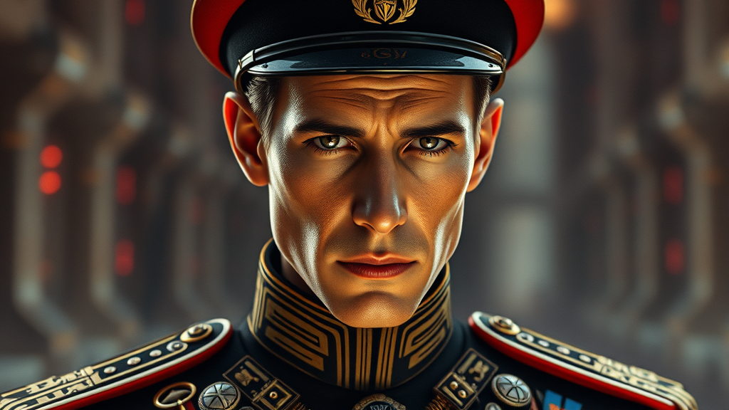 Portrait of Paul Atreides, elegant, adorned in a royal military uniform, showcasing realism and intricate detail in a sci-fi setting. The image should have ultra-high definition, high dynamic range, and an 8K resolution. Inspired by Dark Sushi Mix - Colorful, the portrait avoids duplication, disfigurement, mutation, deformities, cloned faces, and any visual imperfections or artifacts such as low resolution, blurriness, watermark, logos, text, or poor rendering.