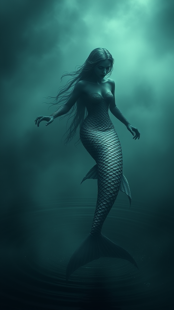 Majestic mermaid gliding through a mist-laden lake, her presence eerie and captivating, with an aura of otherworldly mystery. Her scales glint in the dim light, reflecting intricate designs and patterns like an elaborate mosaic. Eyes hold an unsettling allure, both enchanting and haunting, as if harboring ancient secrets. The setting is enveloped in thick fog, casting shadows that dance across her sinuous form. Ripples disturb the water’s surface, adding an element of creeping tension to the scene. Dark, dramatic lighting enhances the spine-tingling atmosphere of a cinematic, photorealistic landscape.
