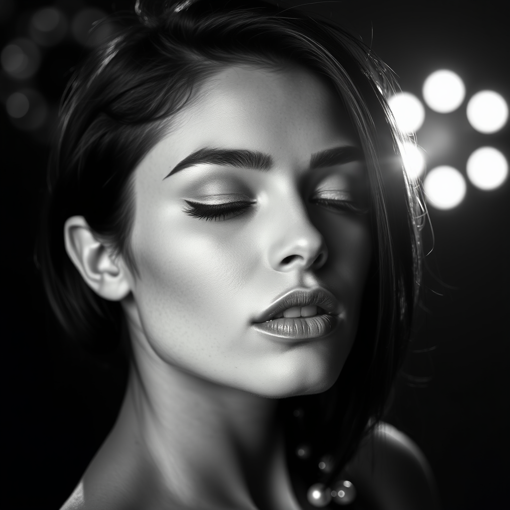 A stunning black and white fashion editorial captures the close-up portrait of an exquisite dark-haired woman with elegant, angular features, posed gracefully under dramatic studio lighting that illuminates her skin and contours subtly. Her eyes are gently closed, exuding serenity and strength in this high-resolution, professional photograph. The cinematic angle and dynamic lighting create a luminous halo effect, highlighting her natural beauty and form.