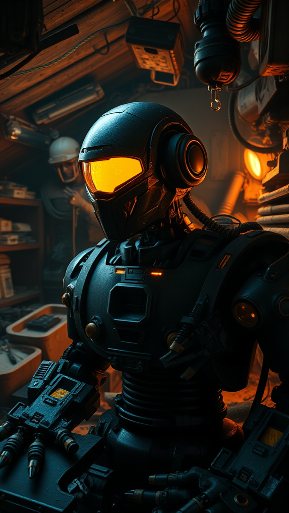 Masterpiece, top-tier quality, ultra high resolution, wide angle scene in a chaotic, disorganized cabin, capturing action in League of Legends style, vivid and photo-realistic with dramatic and dark tones. A robot in ruins, with a glowing yellow visor, portrayed as a sci-fi cyberpunk gangster. This is a medium shot with intricate details, created using Unreal Engine, featuring cozy indoor lighting. Influenced by the styles of James Gurney and Katsuhiro Otomo, it showcases cinematic and vibrant nature elements. Craig Mullins and Greg Rutkowski inspire the volumetric lighting, trending on ArtStation with octane rendering, emphasizing sharp focus and studio-quality detailing. An intricate, highly detailed representation of a Cyber 2077 environment.