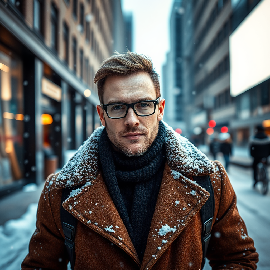 Professional portrait photograph of a striking Norwegian man in stylish winter attire, posing outdoors on a snowy city street, surrounded by a sleek modern urban upscale setting, hyper-realistic, concept art, sophisticated, highly detailed, intricate, clear focus, depth of field, f/1.8, 85mm, medium shot, mid shot, bathed in bright soft diffused light, gentle volumetric mist, trending on instagram, popular on tumblr, hdr 4k, 8k quality, soft dark contrast, serene ambiance.
