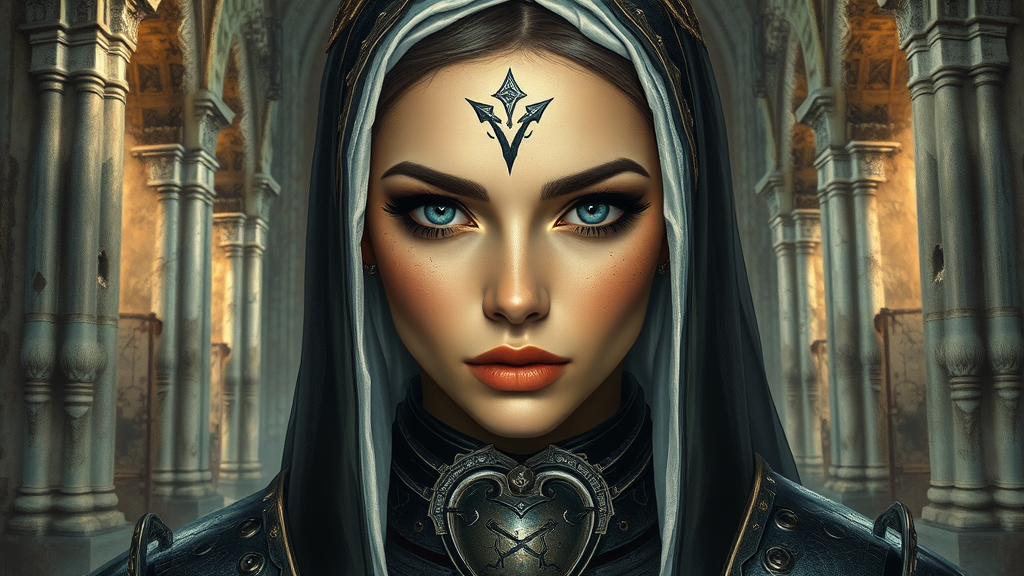 A full body portrait of an exceptionally beautiful woman in a fantastical sci-fi setting, depicted in an oil painting style. She stands as a noble sister of battle within a ruined cathedral, her expressive eyes and dark eyebrows highlighted by tasteful makeup including mascara. Her face is symmetrical and detailed, framed by a forehead tattoo and a heart of steel armor, which is worn and cracked from battles. The environment showcases broken marble walls, laced with dust and bullet holes, illuminated by dramatic, detailed lighting that captures the somber mood of the setting. She wears a veil and headwear, completing her majestic appearance. This scene, inspired by the Warhammer 40k universe, evokes the masterful brushwork of artists like Waterhouse and John Constable, featuring intricate textures and high detail that create a trending piece on ArtStation and CGSociety.