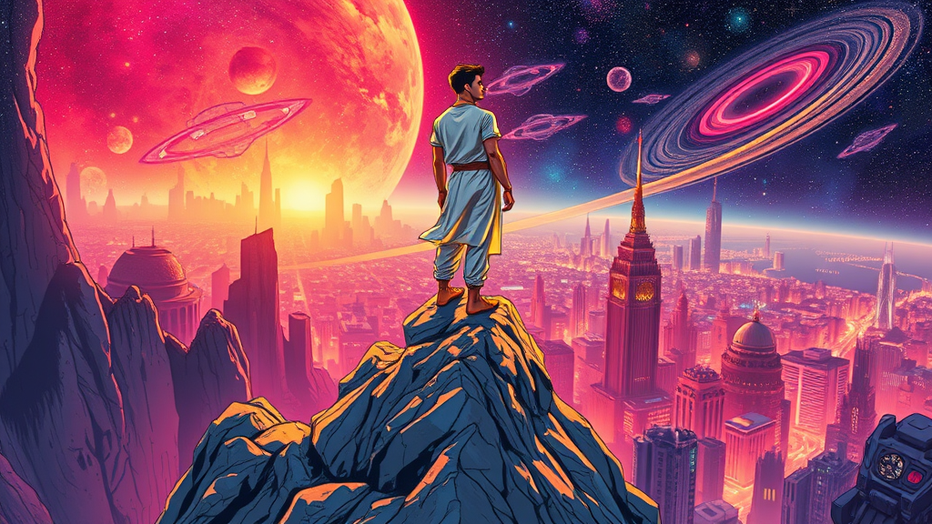 A vibrant scene depicting a man standing atop a jagged rock formation, illuminated by the glow of a neon cityscape in the background. The style blends the colorful and flowing lines typical of Moebius and the intricate details of cyberpunk manga. He is dressed in a white and gold ensemble, exuding a sense of romanticized femininity. The background features meticulously detailed military scenes interwoven with inlay patterns, all set against the vast expanse of space, with swirling galaxies and distant stars. The image captures a sense of serene contemplation amidst the bustling, futuristic world.