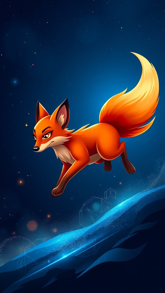 A vibrant, animated fox with a sleek and glossy coat, embodying the essence of the Firefox logo, gracefully dashes through a cosmic nightscape. Its fur shimmers with fiery orange and deep red hues, contrasted by a sparkling deep blue backdrop resembling a universal glow. The fox's eyes are bright and intelligent, reflecting its curious and adventurous nature as it leaps over digital landscapes. Luminous stars and gentle swirls of mist surround it, adding a sense of wonder and exploration. Subtle elements of circuitry trail behind, hinting at its connection to the digital realm, as its quick and elegant movements convey a blend of agility and speed, embodying the spirit of the web.