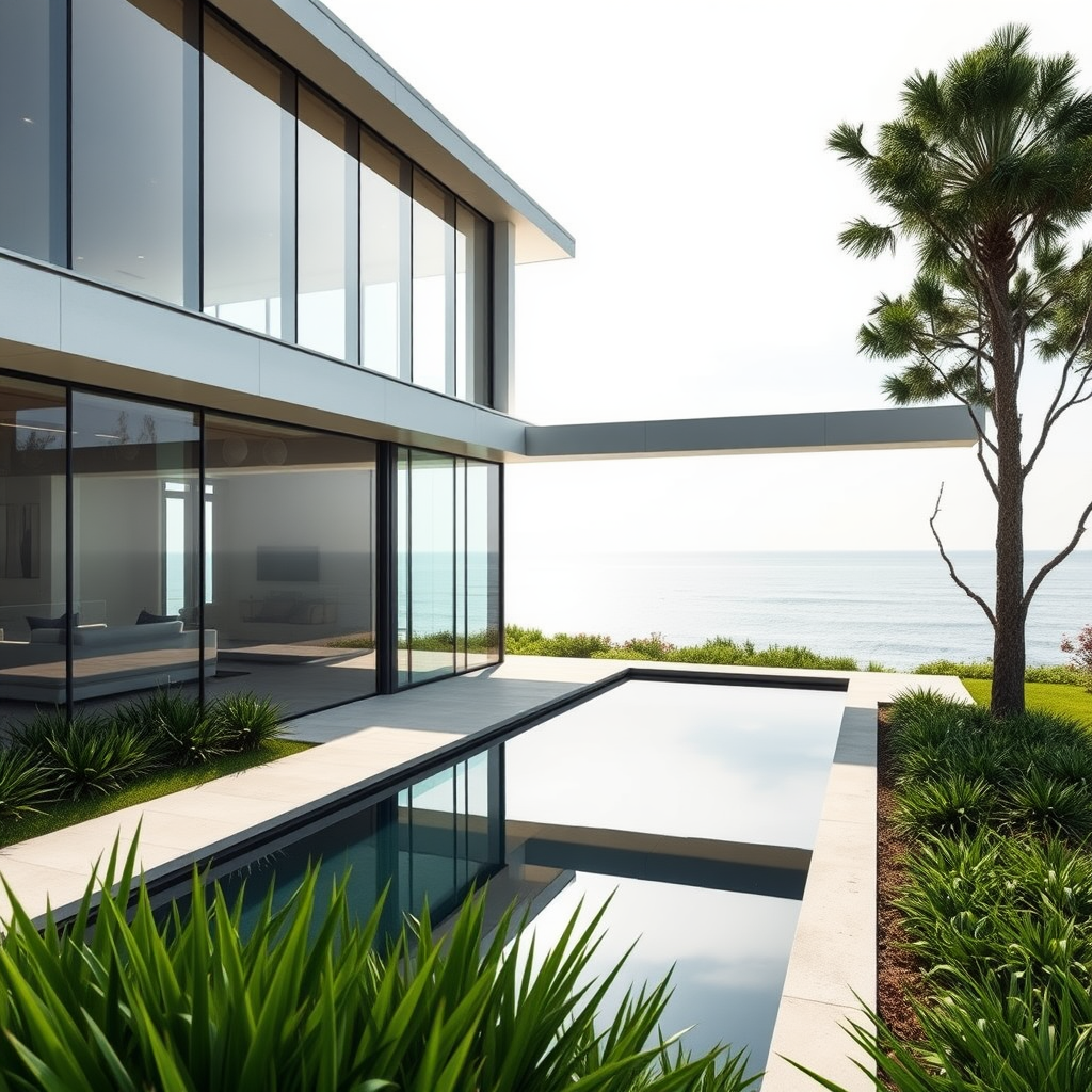Hyper realistic eye level exterior photo of a mid century modern style house with expansive glass walls and a sleek, minimalist design, set against the backdrop of a serene ocean view; daylight floods the scene with soft, diffused lighting. The architecture blends the organic integration of Frank Lloyd Wright, the functionality of Eames, and the precision of Mies van der Rohe, enhanced by green landscaping and a reflecting pool for an added touch of tranquility.