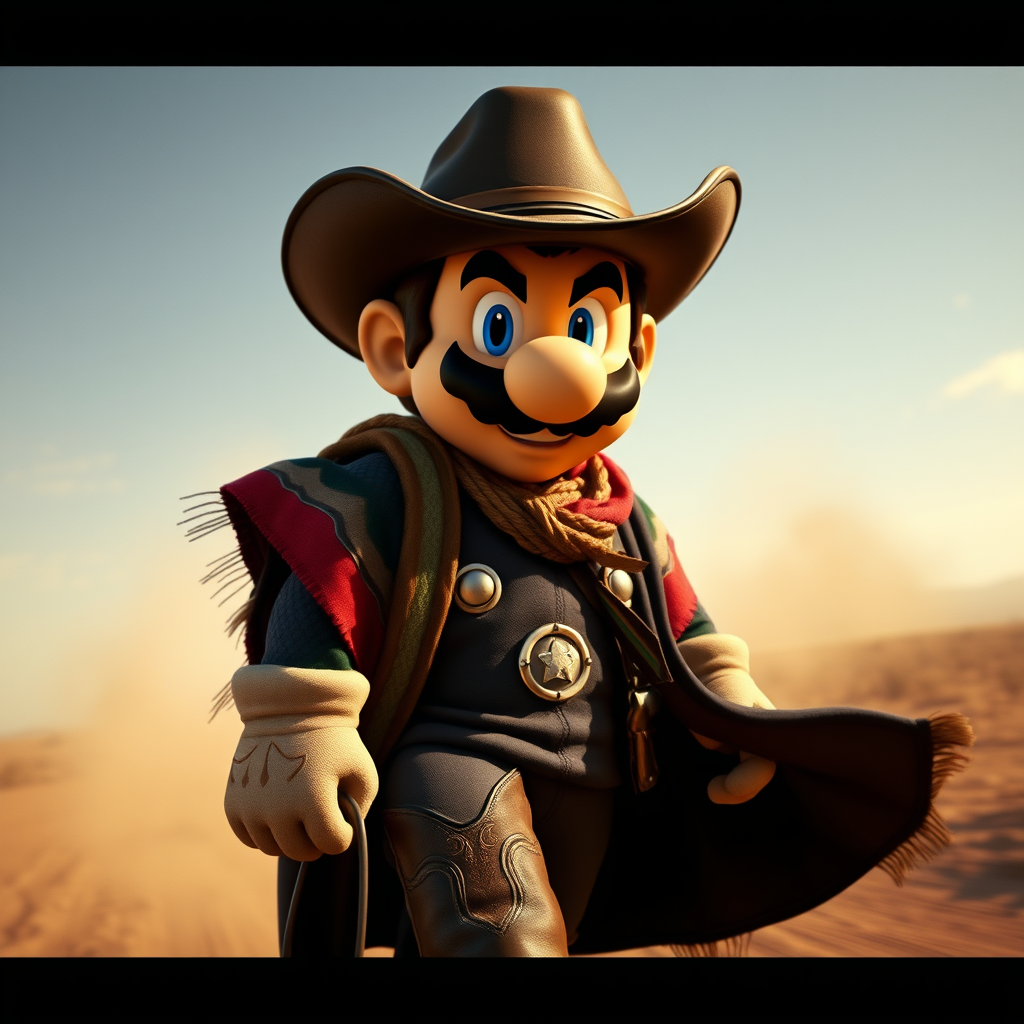 Super Mario sporting a rugged outlaw look reminiscent of Red Dead Redemption, complete with a wide-brimmed cowboy hat, a colorful poncho draped over his sturdy shoulders, and classic cowboy boots. His black duster coat billows around him as he strides confidently through a dusty wild west landscape, capturing the essence of the frontier in a cinematic motion picture shot, with his signature mustache and determined expression adding a unique charm to this mashup of iconic characters.