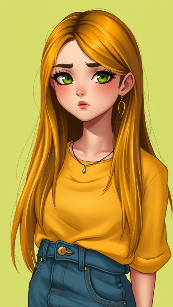 A digital artwork of a young woman in a character portrait trending on Artstation. She has sunburst yellow, long, straight hair, and dark emerald green eyes. The background is a soothing almond green, complementing her dark banana yellow shirt and simple jeans. At 20 years old, she has a mature appearance with a bit of weight gained, adorned with golden earrings and a silver simple necklace. The artwork captures an essence of slight embarrassment in her expression. The illustration is highly detailed, set in 8k resolution. Her features show subtle imperfections, adding character and uniqueness to the portrayal.