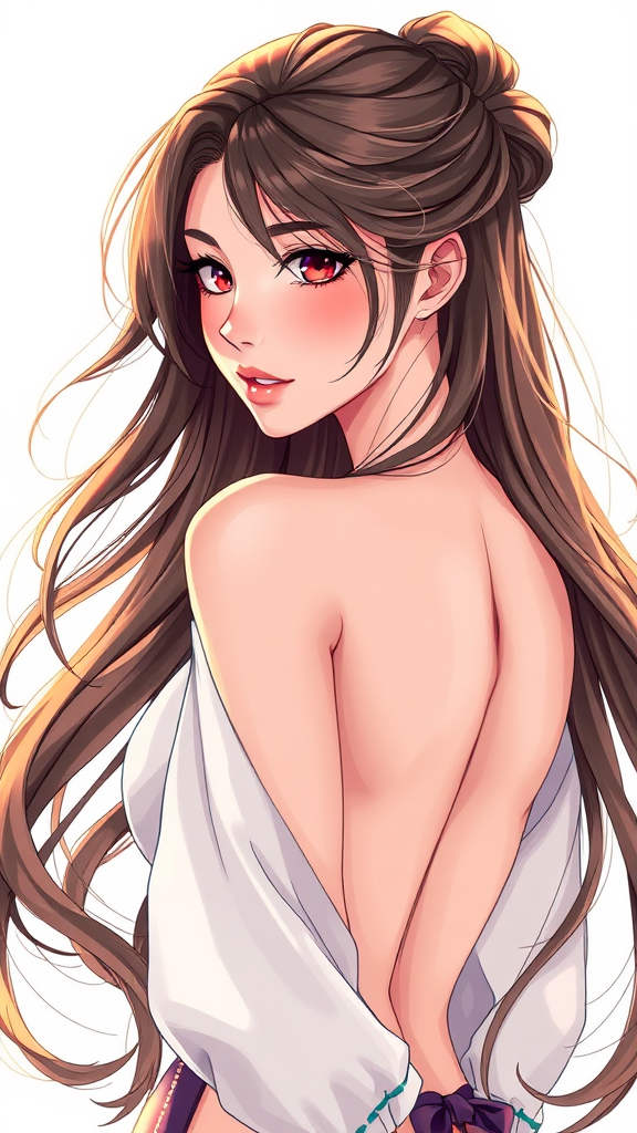 Stunning digital illustration of a 20-year-old woman showing her back to the camera, posing with long flowing hair, exuding an alluring and sultry facial expression. The artwork is filled with natural colors, ultra-detailed, and unforgettable with its intricate design. The style combines elements of niji, comics, and anime, avoiding any low-quality features like blurriness or graininess. The image is free from duplicates and boasts well-drawn anatomy and proportions, with no text, name, signature, watermark, or logo elements. The final piece is in high-resolution, capturing every detail without any jpeg artifacts or cut-offs, emphasizing good anatomy and a well-structured body and face.