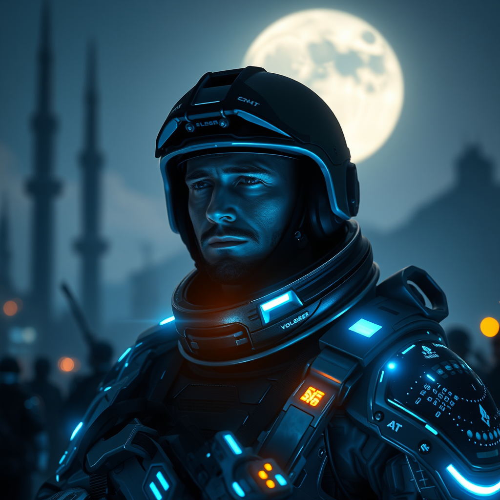 Volodímir Zelenski as a futuristic soldier, illuminated by ethereal moonlight and the distant glow of warfare, casting a radiant blue aura. The scene has shallow depth of field with cinematic, volumetric lighting, showcasing intricate, ultra-realistic details. Adjustments include a backdrop of towering, shadowy structures hinting at a dystopian world, with holographic elements reflecting off his gear, maintaining the intense chaos of a battlefield, aspect ratio 12:24.