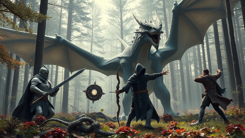 An epic fantasy battle unfolds in a cinematic and photorealistic image set within a vibrant yet desaturated forest. At the center, a paladin stands in intricately detailed armor, wielding a subtly radiant sword and shield, exuding an aura of valiant strength. To his side, a mysterious wizard cloaked in a hooded robe covered in intricately etched arcane symbols holds a staff topped with a softly glowing orb, their face shadowed to enhance the air of enigma. Flanking them, a nimble ranger in a finely crafted leather cloak readies a longbow, eyes fixed on the formidable foe. Opposing them is a colossal, three-headed dragon, each head showcasing richly textured scales in muted tones, creating an imposing yet beautifully detailed adversary. The forest setting features sharp, clear lighting and understated natural colors that emphasize the crisp details of the characters and their lush surroundings. Small creative touches include the dragon's tails flicking through the air, scattering fallen leaves, and the subtle glow from the paladin's sword casting soft reflections on nearby trees.