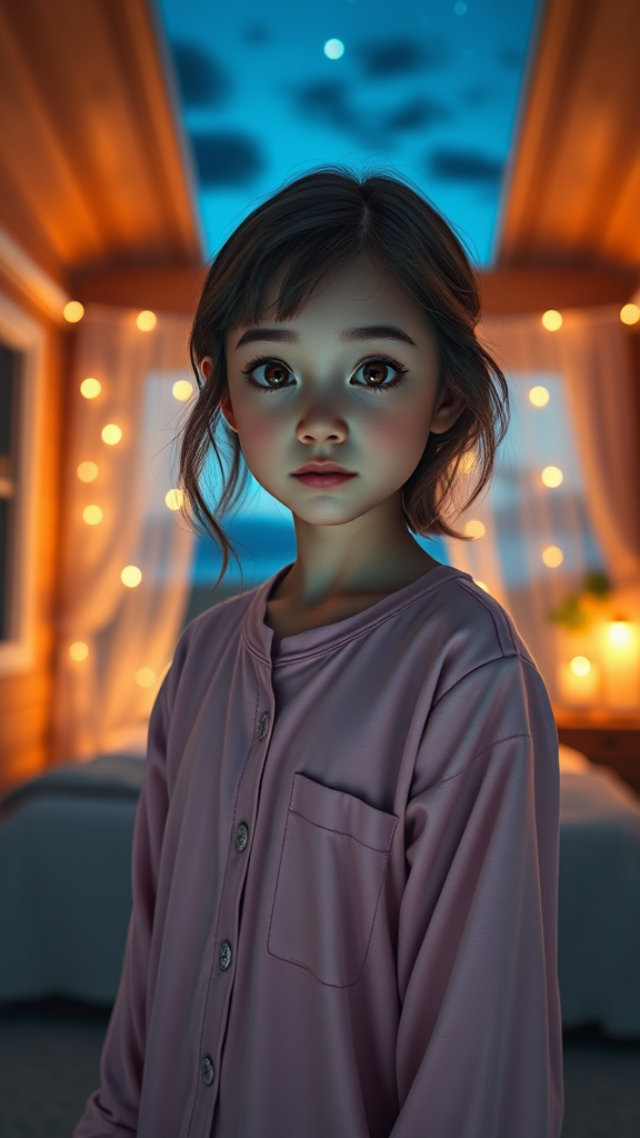 Ultra-detailed full body portrait of a girl standing solo in a beautifully detailed bedroom under a night sky. The scene features professional and cinematic lighting with photon mapping and radiosity for a realistic effect. Her eyes and face are extremely detailed, with captivating eyes, beautifully shaped lips, and soft light accentuating her features. She is wearing pyjamas and is depicted in a full-body shot, gazing directly at the viewer. The setting is outdoors with a serene sky, adding to the overall beauty of the composition. The focus is on maintaining a perfect form and avoiding any distortions or imperfections, such as extra or missing fingers, blemishes, or poorly drawn features. The result is a harmonious blend of natural beauty and artistic precision.