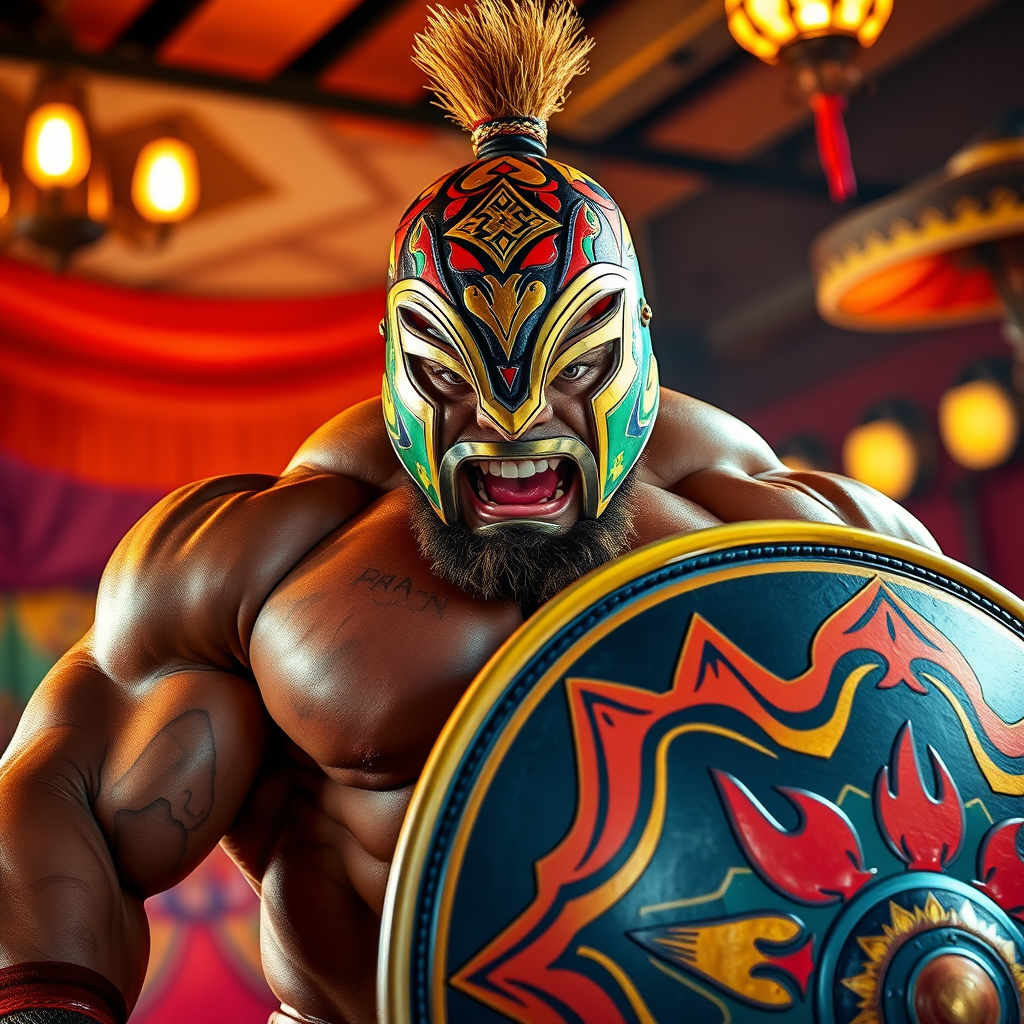 Capture El Tigre Braum in a hyper-realistic photograph set against a lively and colorful Mexican-inspired setting, showcasing his towering and muscular build, intricately designed luchador mask, and signature shield using advanced lighting techniques and dynamic posing. Emphasize the nuances of his fierce and determined expression to convey strength and agility. Incorporate a vivid color palette with bursts of orange and yellow to encapsulate the vibrant and energetic essence of El Tigre Braum. Make subtle creative adjustments while preserving the core concept.