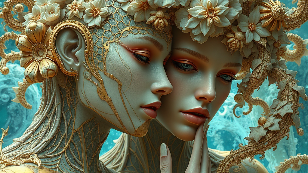 Visual fiction by Christiano V, blending a Franciszek Starowieyski-inspired aesthetic with hyper-realistic sci-fi and romantic fantasy elements. Illustrations feature rich gold and cyan tones, with intricately detailed organic sculpting reminiscent of Android Jones. The artworks explore a surreal and emotive narrative, capturing futuristic romance and ethereal worlds.