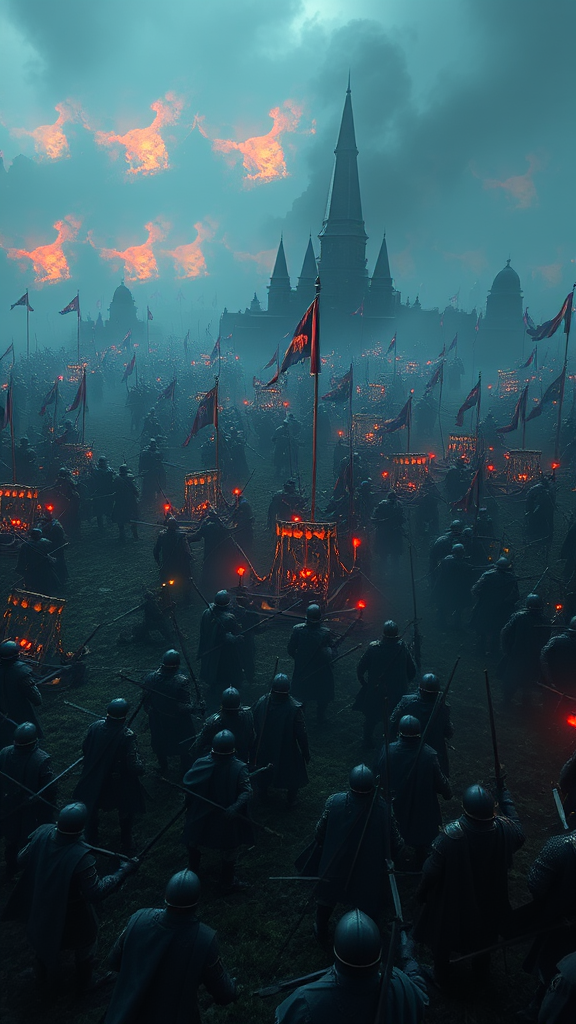 A stunning medieval battlefield scene set in a fantastical world filled with hundreds of warriors engaged in epic warfare. The digital art captures a dark, atmospheric landscape with vibrant colors and glowing effects. The illustration combines a hand-drawn aesthetic with the ultra-detailed, cinematic quality of an 8K render using Octane Render, Cinema 4D, and Blender. It evokes a sense of drama and humor, reminiscent of a masterpiece oil painting by artists like Ed Blinkey, Atey Ghailan, and Studio Ghibli, fused with the photorealistic style of Jeremy Mann, Greg Manchess, and Antonio Moro. This high-detail piece is trending on ArtStation and CGSociety, showcasing intricate design and sharp focus. It's a concept art piece with vivid colors in a model-shoot style, achieving a hyperrealistic effect admired by art enthusiasts.