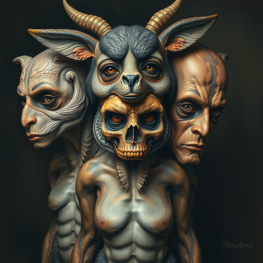 Absurdres, highly detailed faces, cinematic and intricate painting with dim natural lighting, features animals with a focus on HDR quality, depicting stacked torsos reminiscent of a totem pole. Emphasizes elements of surreal and distorted anatomy such as extra, missing, or floating limbs, resulting in a mutated appearance. The image conveys a sense of the bizarre and grotesque, with an underlying theme of disconnection and transformation.