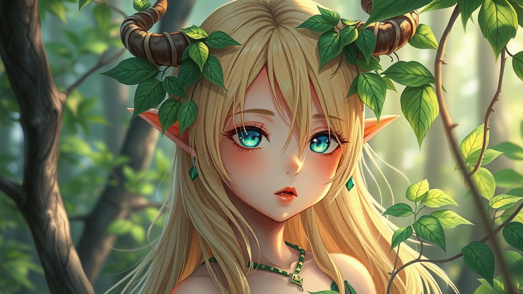 Blond-haired girl with delicate horns adorned by emerald leaves, crafted in detailed digital anime art style, resembling loish and wlop inspirations. The scene captures an adorable elf girl in a hyper-detailed fantasy world, with influences from guweiz and WLOP art styles. This anime-styled 3D digital painting showcases her ethereal presence in a lush, enchanted forest, blending fanart nuances with a unique creative twist.