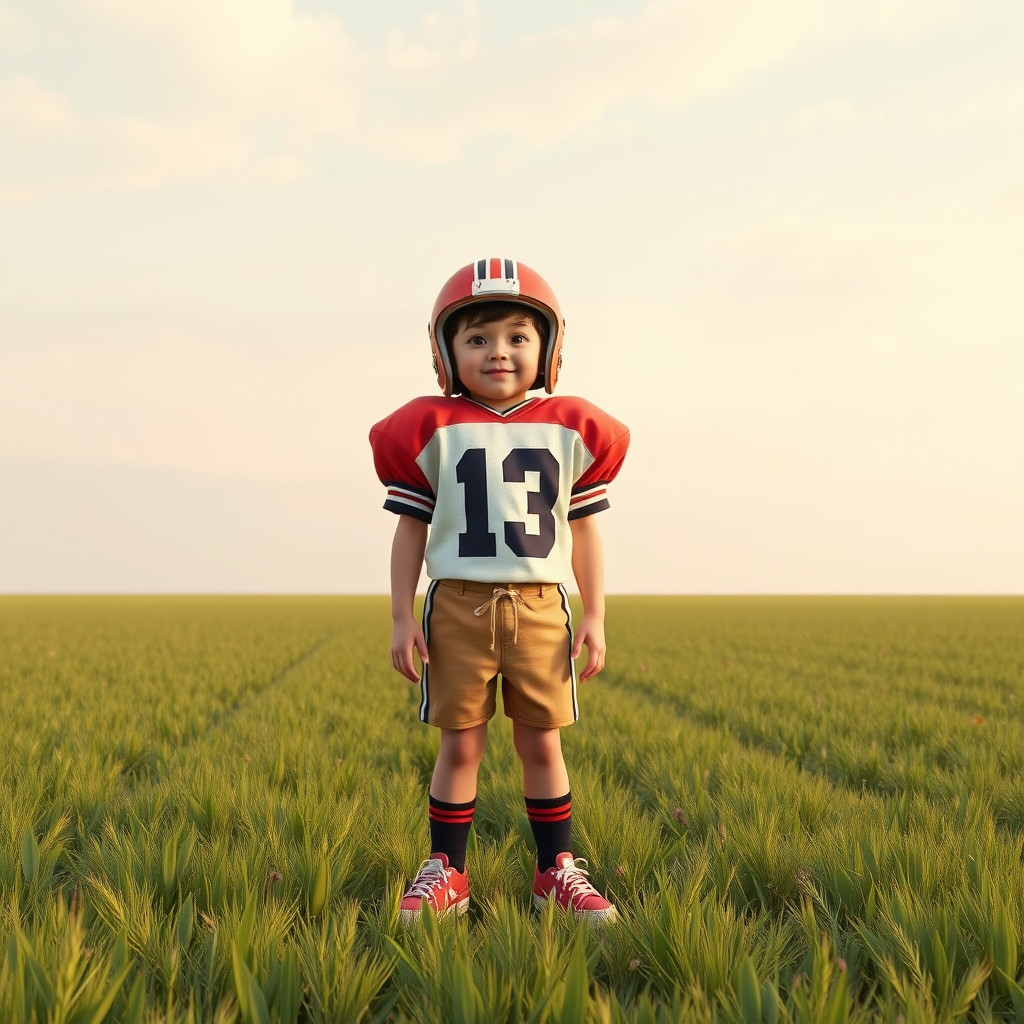 Little boy in a vintage American football outfit standing on a vast grassy field, digital art inspired by Yanjun Cheng's whimsical style, with an aesthetic reminiscent of the lofi girl internet meme. The scene captures a blend of retro anime and cartoon style illustration, featuring bright pastel colors and a dreamy atmosphere. Imagine a catalog photo composition with influences from Beeple, Rhads, and Lois van Baarle, creating a sense of nostalgia with a modern twist. A beautiful artwork that evokes a playful yet serene vibe, with the spirit of an iconic trending piece on Dezeen.